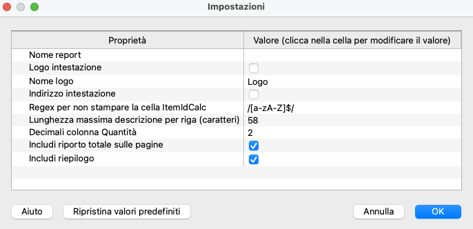 - Serve per definire il nome del report, utilizzato nella visualizzazione dell'anteprima di stampa e per il nome del salvataggio del file.