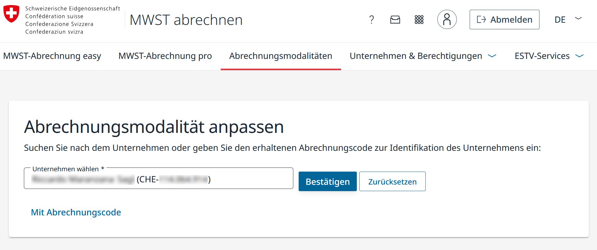 - Wählen Sie den Firmennamen und die entsprechende MWST-Nummer aus.