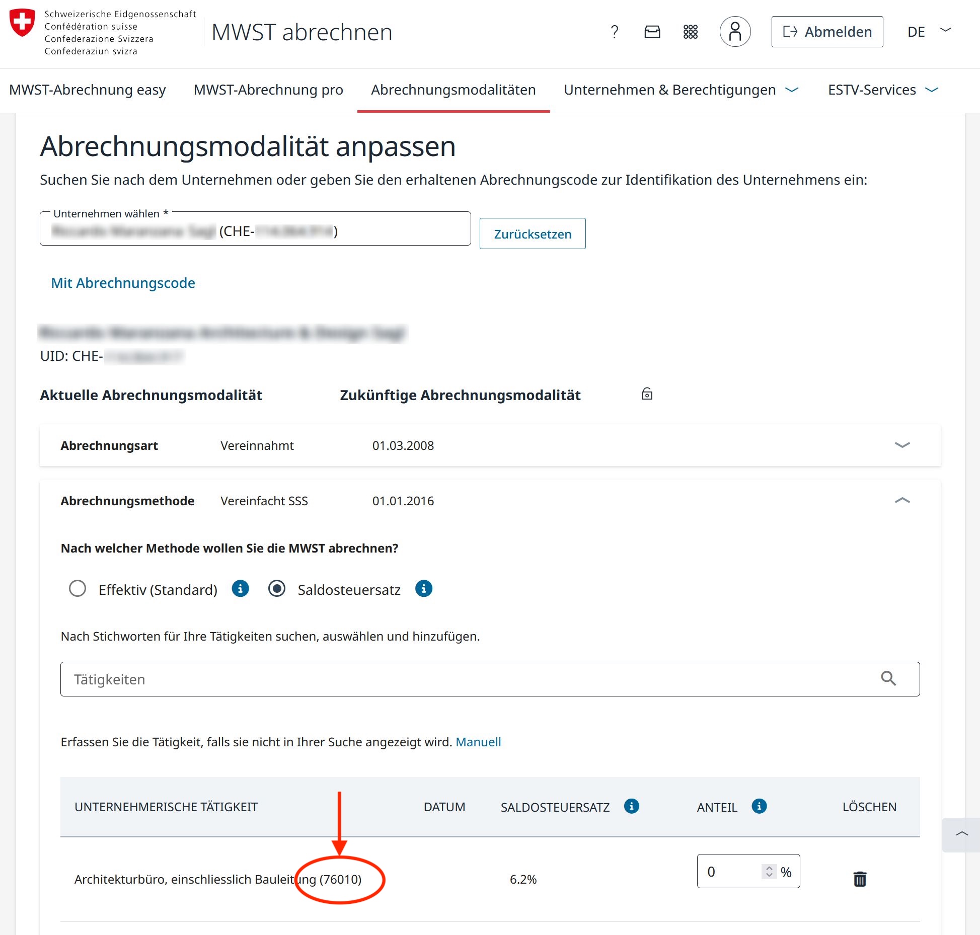 - Wenn kein Tätigkeitscode angezeigt wird, müssen Sie sich direkt an die ESTV wenden, welche die Codes zur Verfügung stellt.
