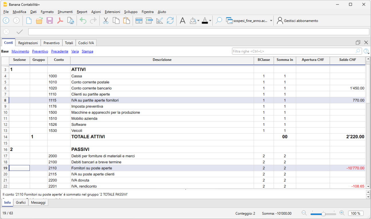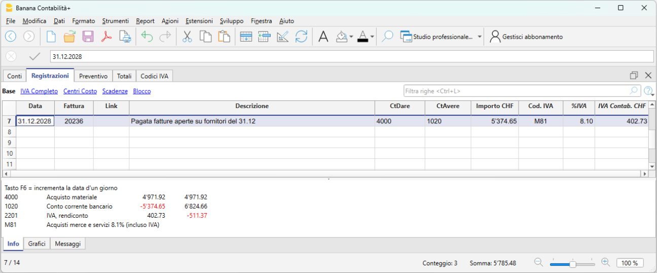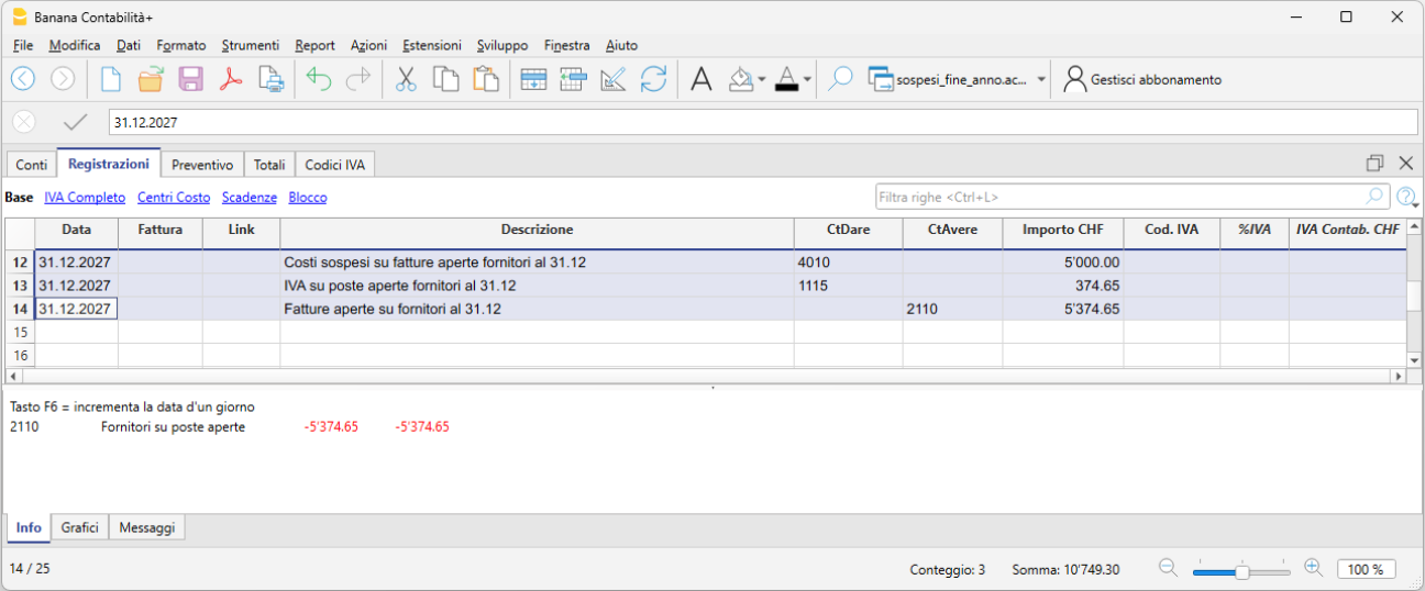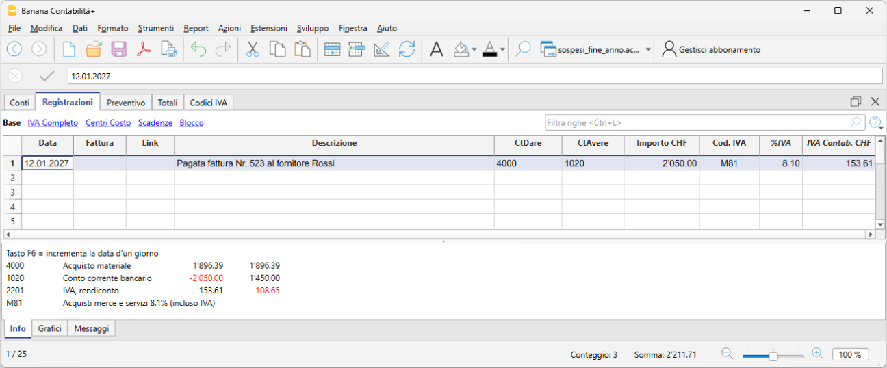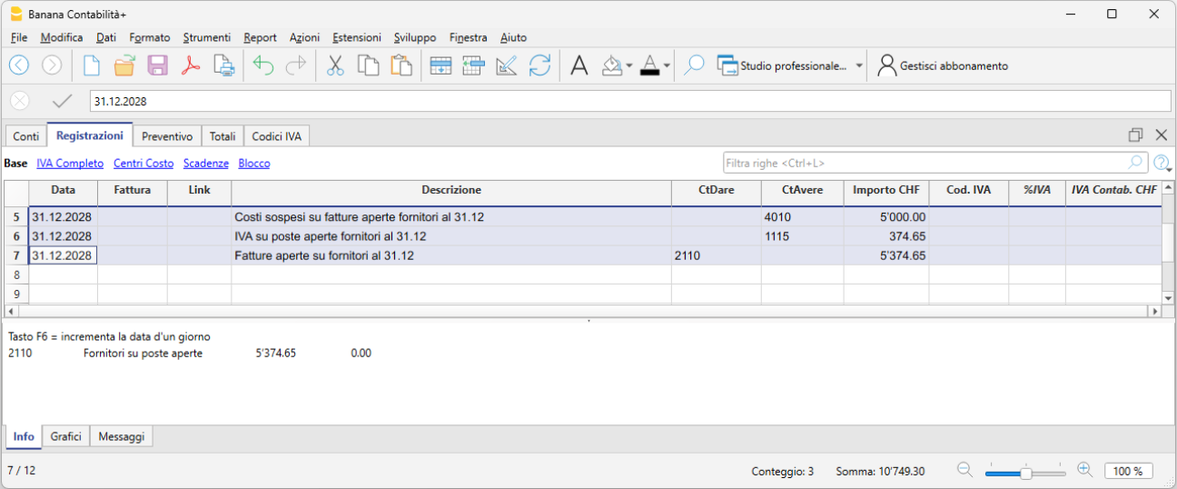 L’esempio seguente mostra una possibile registrazione in Banana Contabilità per una fattura fornitore aperta al 31.12.