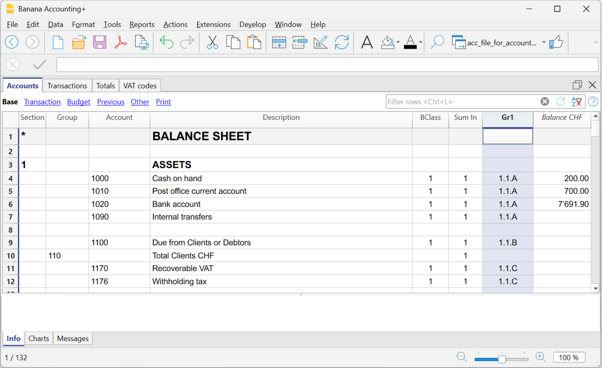 - Nella tabella Conti visualizza la colonna Gr1, dal menu Dati > Disponi colonne
