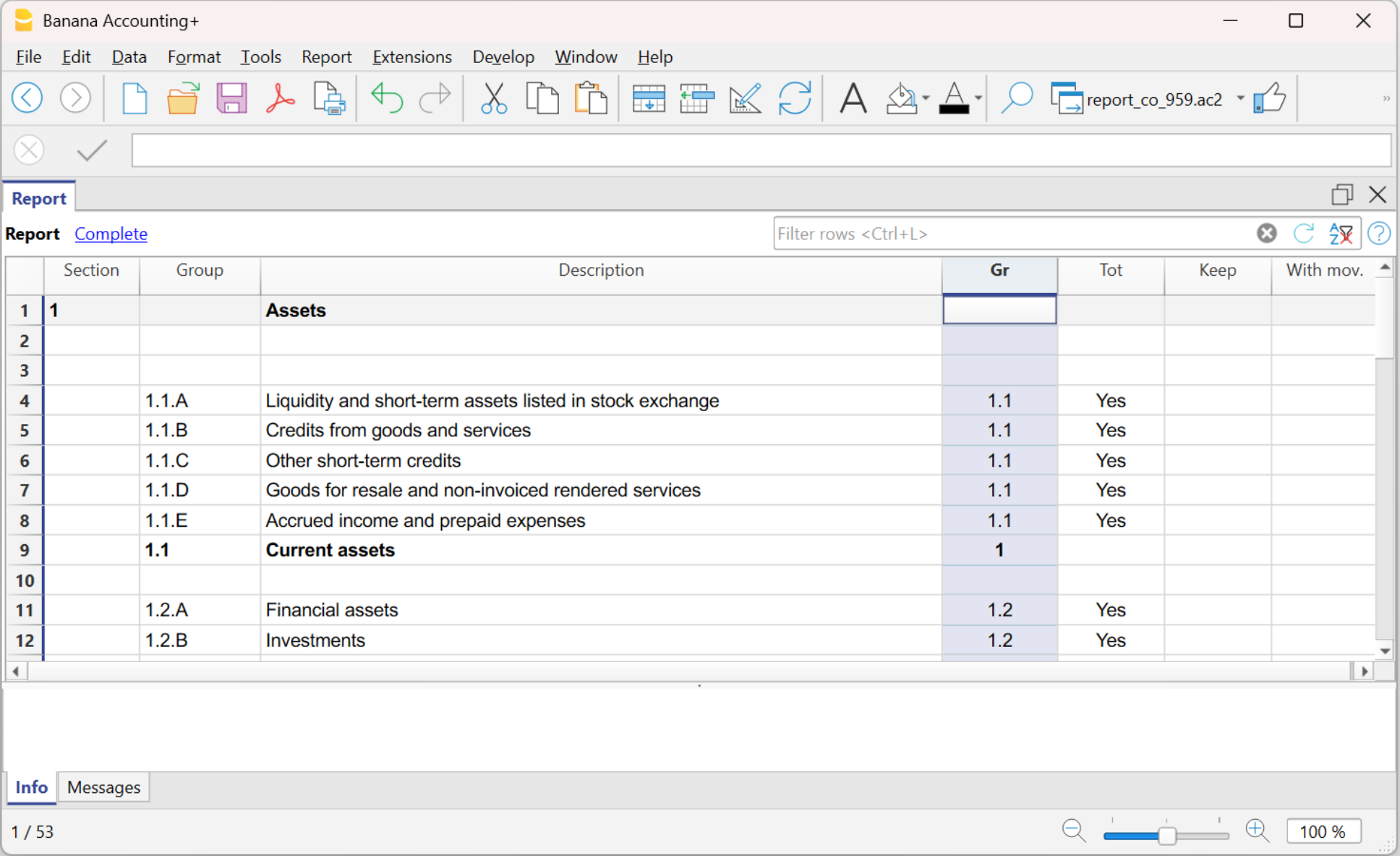 - Per ogni conto della tabella Conti, nel file della contabilità, nella colonna Gr1, abbinare la numerazione del gruppo di totalizzazione presente nel file Report contabile.