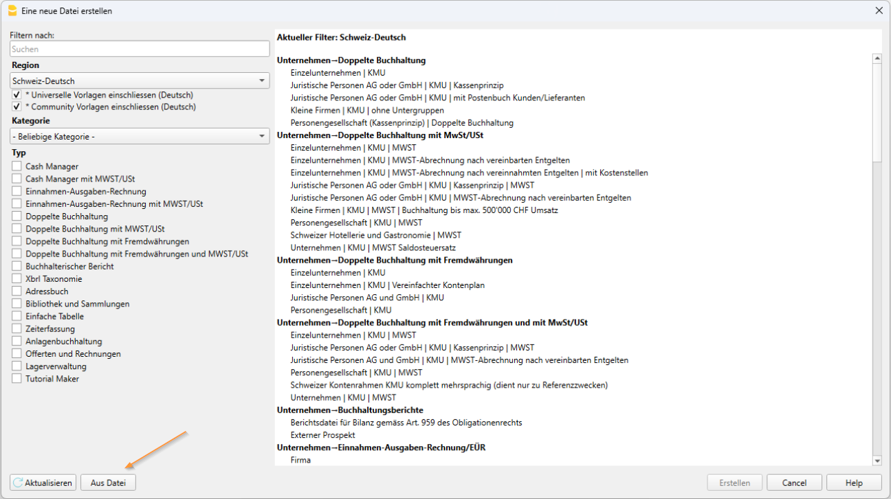 Dieses Verfahren erstellt eine neue Datei basierend auf einer vorhandenen Dateivorlagen. Es stehen zahlreiche Vorlagen zur Verfügung, die für verschiedene Rechtsformen und Geschäftsbereiche (Aktivitäten) geeignet sind.