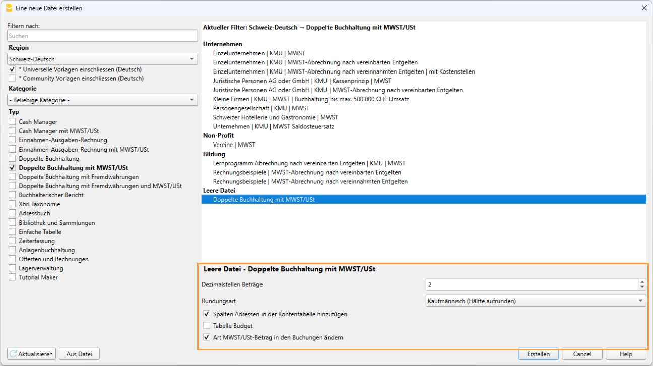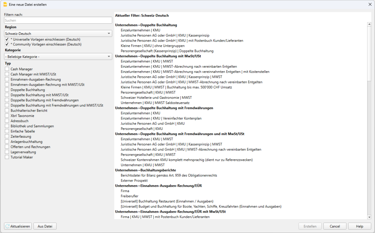 Die angezeigten Vorlagen hängen von der ausgewählten Region und Sprache ab. In der Abbildung sind beispielsweise die deutschsprachigen Vorlagen für die Schweiz zu sehen. Wird als Region "Schweiz-Italienisch" gewählt, erscheinen die Vorlagen auf Italienisch.