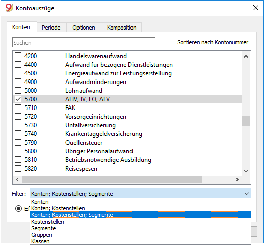 - Dank dem Filter kann man automatisch alle Kontoauszüge, die man ausdrucken will, auswählen (z.B. nur Konten, Kostenstellen, Segmente)