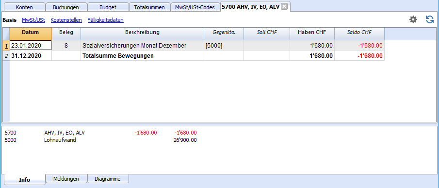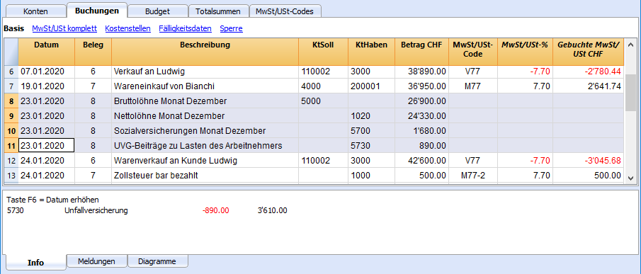 - Auf der ersten Buchungszeile wird das Konto '1020' als Gegenposten aller folgenden Buchungen betrachte.