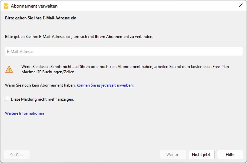 - Beim ersten Start des Programms erscheint ein Dialogfenster, in dem Sie Ihre E-Mail-Adresse eingeben und Ihr Abonnement verwalten können.