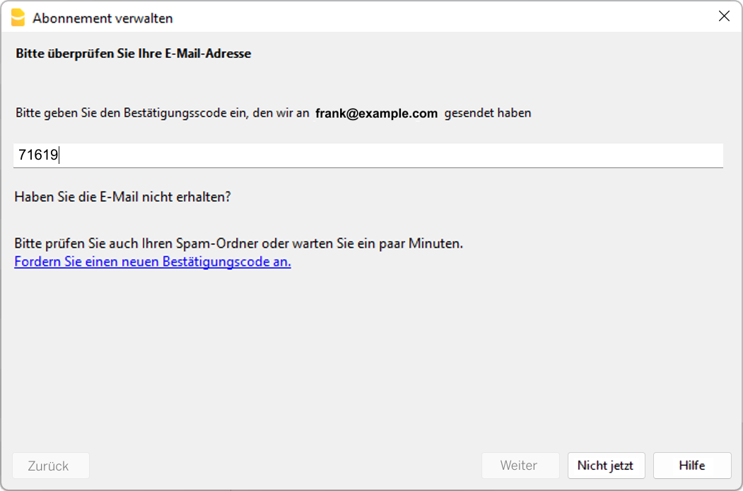 - Kehren Sie nach dem Erhalt der E-Mail zu diesem Dialogfenster zurück, indem Sie im Menü Hilfe > Abonnement verwalten wählen, und geben Sie dann den erhaltenen Bestätigungscode ein.