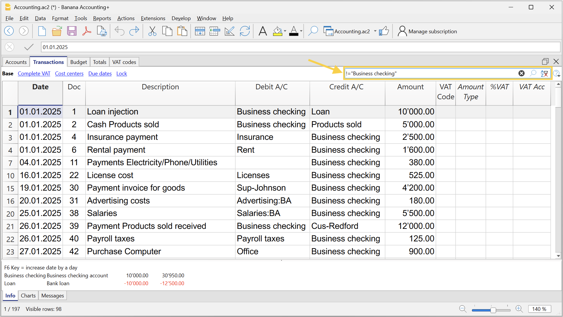 Die Funktion 'Temporärer Zeilenfilter' ist nur im Advanced-Plan von Banana Buchhaltung Plus enthalten. Mit den Free- oder Professional-Plänen kann sie ebenfalls getestet werden – jedoch lediglich bis zu 70 Buchungszeilen.