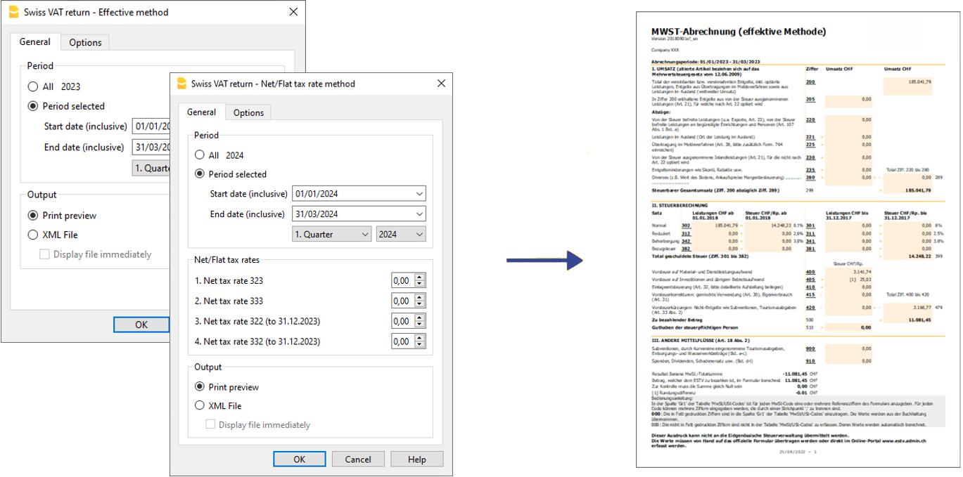 Mit nur wenigen Klicks erhalten Sie das Schweizer Mehrwertsteuerformular, detaillierte Zusammenfassungen pro Periode, nach Mehrwertsteuersatz, Konto und Prozentsatz, sowohl nur für Gesamtsummen als auch mit allen Buchungen.