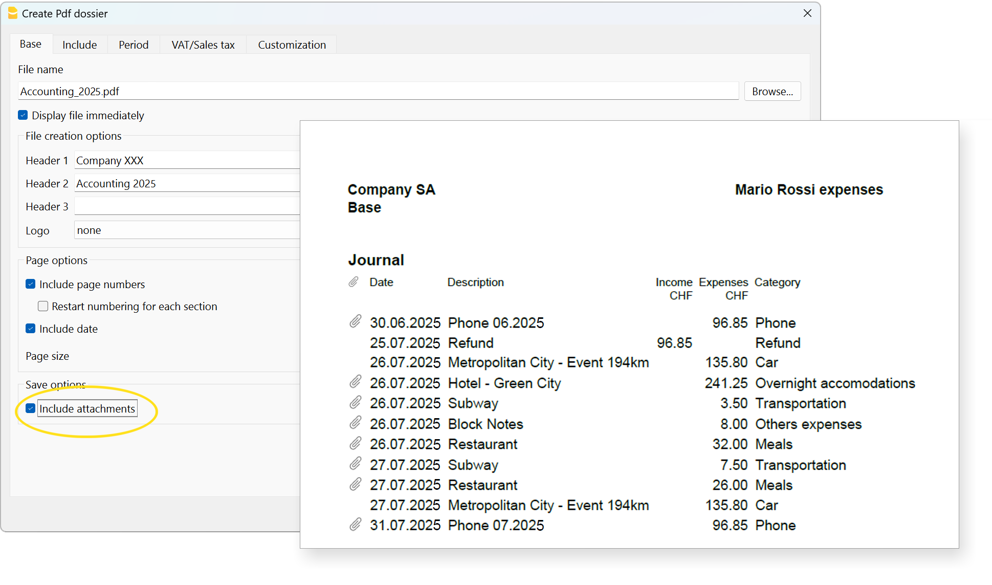 Bei aktivierter Option Anhänge einschliessen werden die digitalen Belege direkt in der generierten PDF-Datei gespeichert. Die Anhänge (z.B. Beilagen oder Belege) sind lokale Dateien, die in der Spalte Link (DokLink) der Tabelle Buchungen hinterlegt wurden.