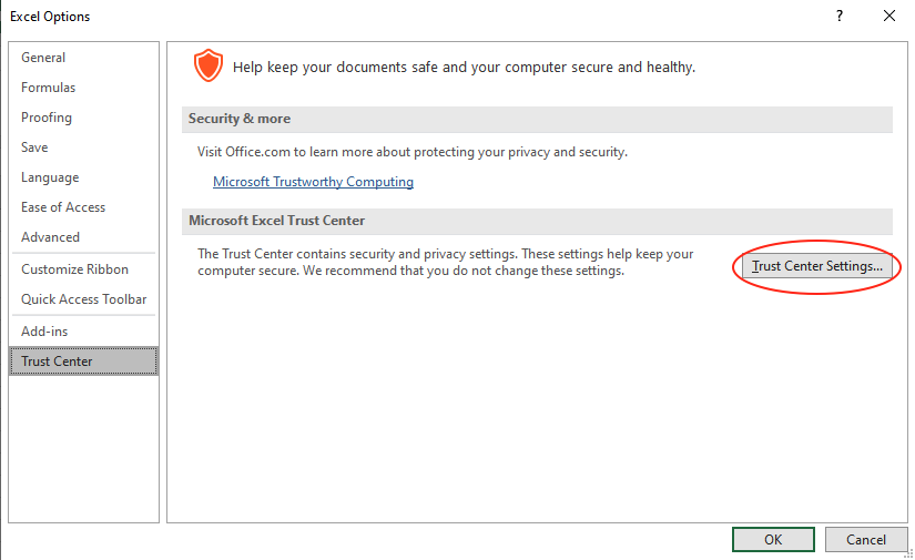 - Choose Trust Center, and then choose the Trust Center Settings button.