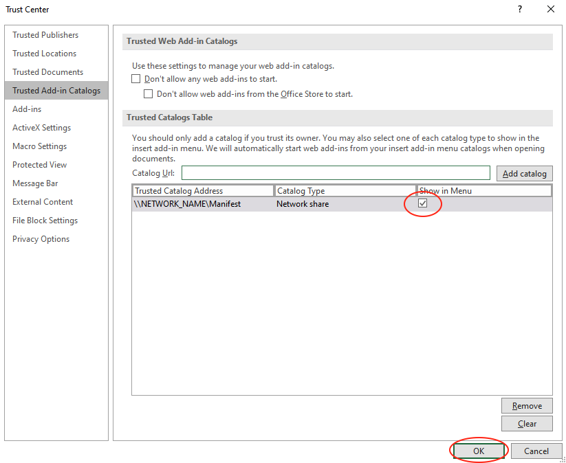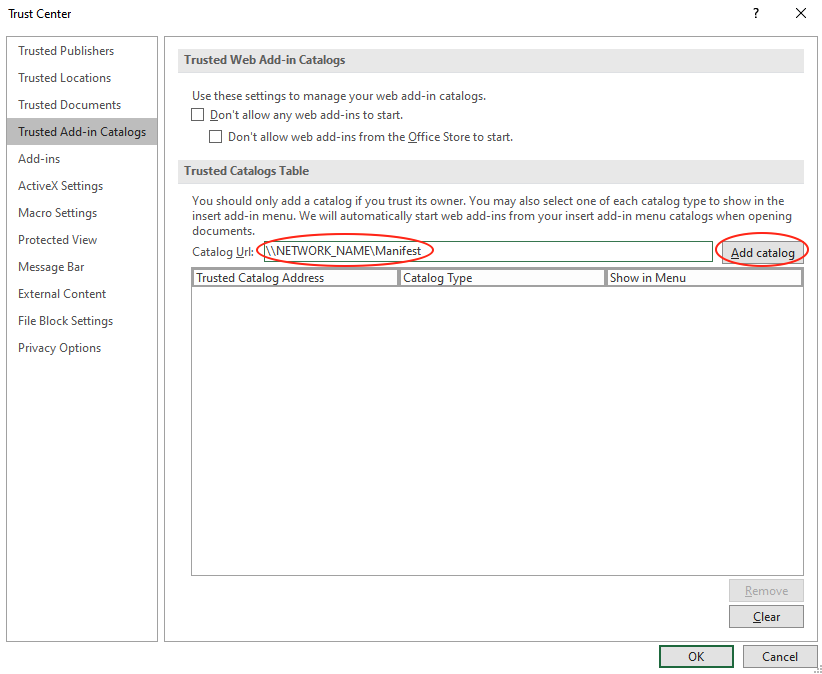 - Tell Excel to use the Manifests directory as trusted app catalog: