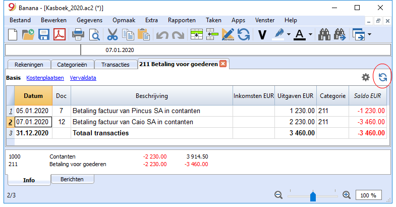 De weergave van de transacties in de categoriekaart lijkt erg op die van de Transactiestabel. Wanneer u nieuwe transacties invoert of veranderingen maakt (altijd in de Transactiestabel) kunt u de categorie- of groepkaart bijwerken door op het Tabel vernieuwen teken (ronde blauwe pijl) aan de rechterbovenkant van het scherm te klikken.