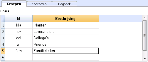 In de tabel Groepen kan men voor iedere rij in de Id kolom een identificatiecode definiëren voor een Groep en de overeenkomstige beschrijving in de kolom Beschrijving invoeren (Bijvoorbeeld, kla - Klanten, lev - Leveranciers, col - Collega's, etc.).