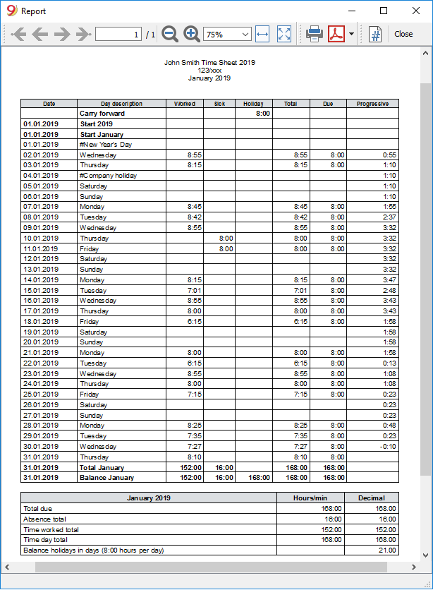 Verschuldigde en gewerkte weekuren en ook het saldo van de vakantiedagen worden automatisch gerapporteerd zoals in het voorbeeld hieronder.