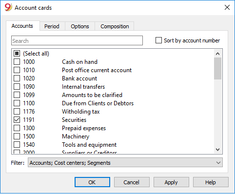• By means of the Filter, all the account cards that need to be printed completely or partially (for example, only accounts, cost centers, segments) can be automatically selected