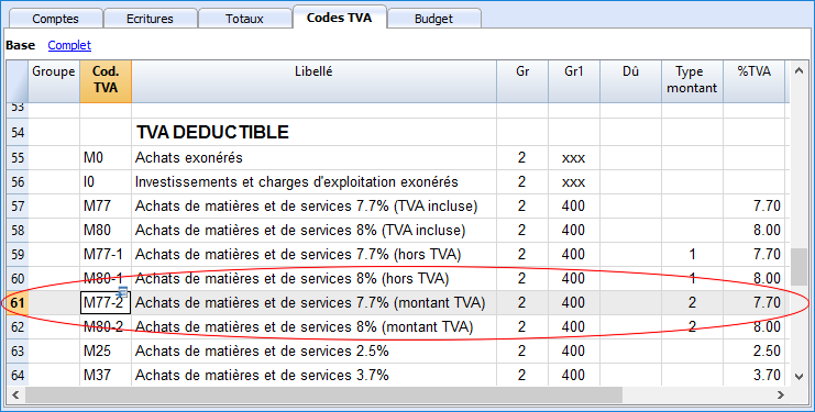 Note: Dans le tableau Codes TVA, des nouveaux codes peuvent être ajoutés. En cas de besoin, pour la TVA à 2.5%, pour récupérer la TVA à l'importation, il suffit d'ajouter un nouveau code, par exemple M25-2, et de le compléter avec le même GR, GR1, le type de montant 2 et d'insérer 2.5 comme taux.