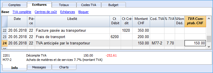 Dans le tableau Ecritures, insérer le compte de la caisse en crédit, le montant payée pour la TVA et le code TVA correspondant.