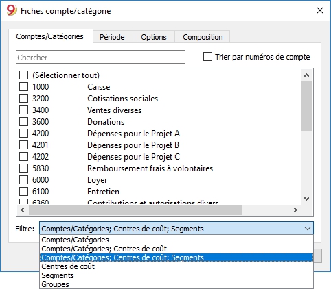 - A travers le Filtre, on peut automatiquement sélectionner toutes les fiches de compte à imprimer ou seulement une partie (par example, seulement les comptes, les centre de coût ou les segments)
