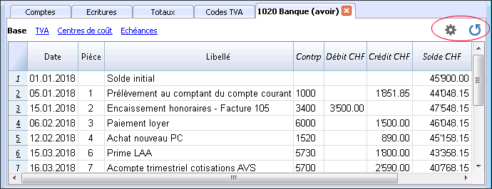 Dans les fiches de compte, la colonne Contrepartie (Contrp), qui indique le compte qui complète l'écriture, est affichée.