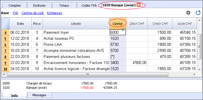 - Dans la fiche de compte des lignes d'écritures suivantes (4500, 6700, 6700), la contrepartie (commune) est indiquée entre des crochets [1020], et indique une contrepartie déduite.