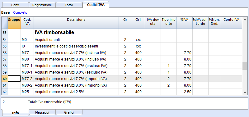 Nella tabella Codici IVA possono essere aggiunti dei nuovi codici. Nel caso si necesittasse il codice IVA al 2.5%, per il recupero dell'IVA doganale, basta aggiungere un codice nuovo, es. M25-2, completando con lo stesso GR, GR1, il tipo di importo 2 e inserendo come aliquota 2.5.