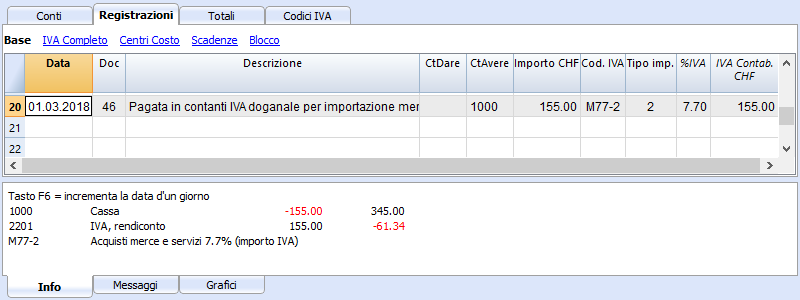 Nella tabella Registrazioni inserire in avere il conto della cassa, l'importo pagato per l'IVA e il codice IVA corrispondente.