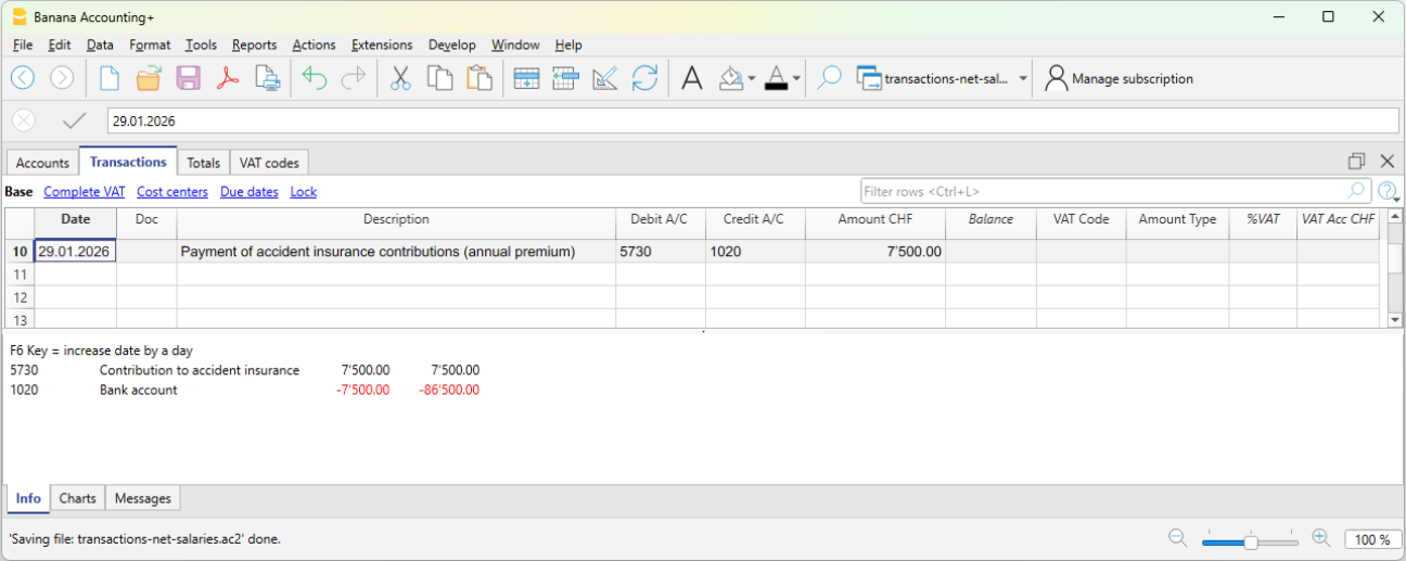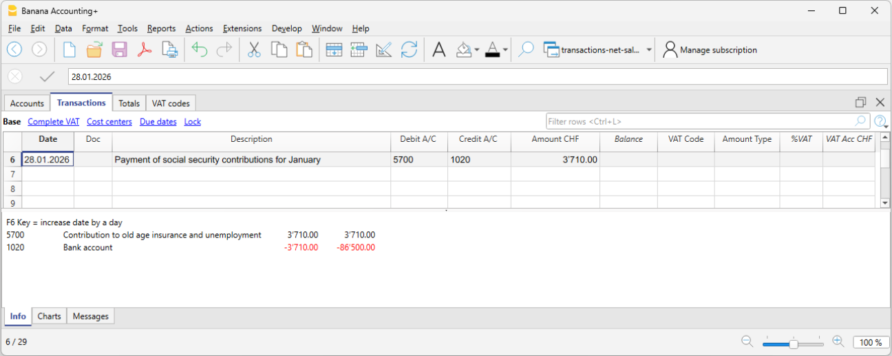 Quando si pagano i contributi assicurativi, per esempio LAINF o LAINF complementare, si registra il pagamento verso l'ente assicurativo.