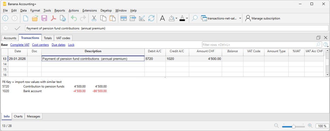 • Nella colonna Dare, il conto 5720 Contributi previdenza professionale obbligatoria