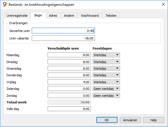 In het tabblad Begin kunt u de startgegevens voor werktijden en vakantie opgeven.