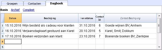 In de tabel Dagboek kunt u dagelijks allerlei notities vastleggen en verwijzen naar contacten uit de tabel Contacten.