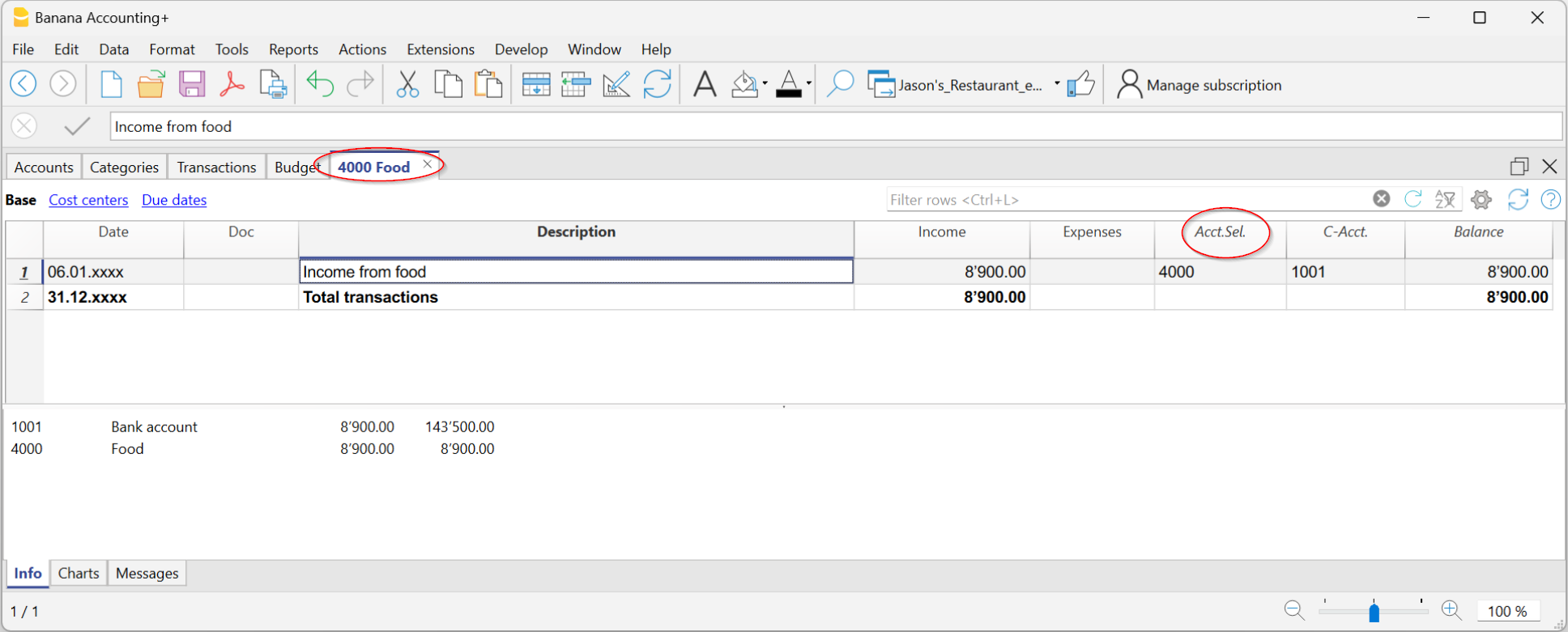 In the Account selected column, which can be made visible, starting from any account card, via the Data > Columns setup menu, the account on which the transaction took place will be displayed.
