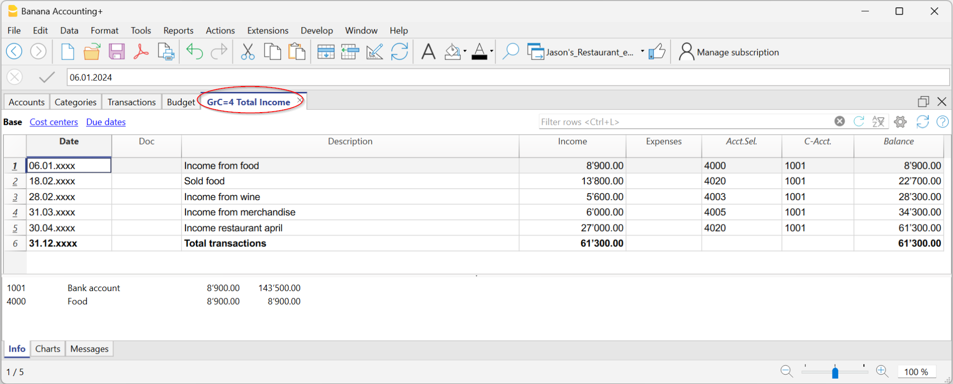 In the account card of a group or class, all the transactions of those accounts belonging to the selected group or class are regrouped.