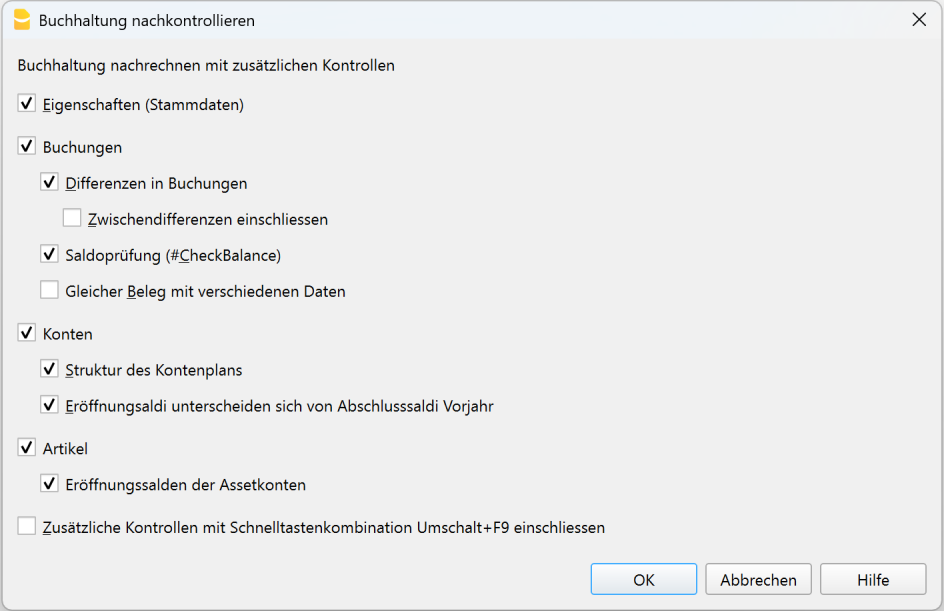 Wenn die Option Zusätzliche Kontrollen mit Schnelltastenkombination Umschalt+F9 einschliessen aktiviert ist, führt das Programm automatisch alle im Dialogfenster Buchhaltung nachkontrollieren ausgewählten Prüfungen auch über die Tastenkombination aus.