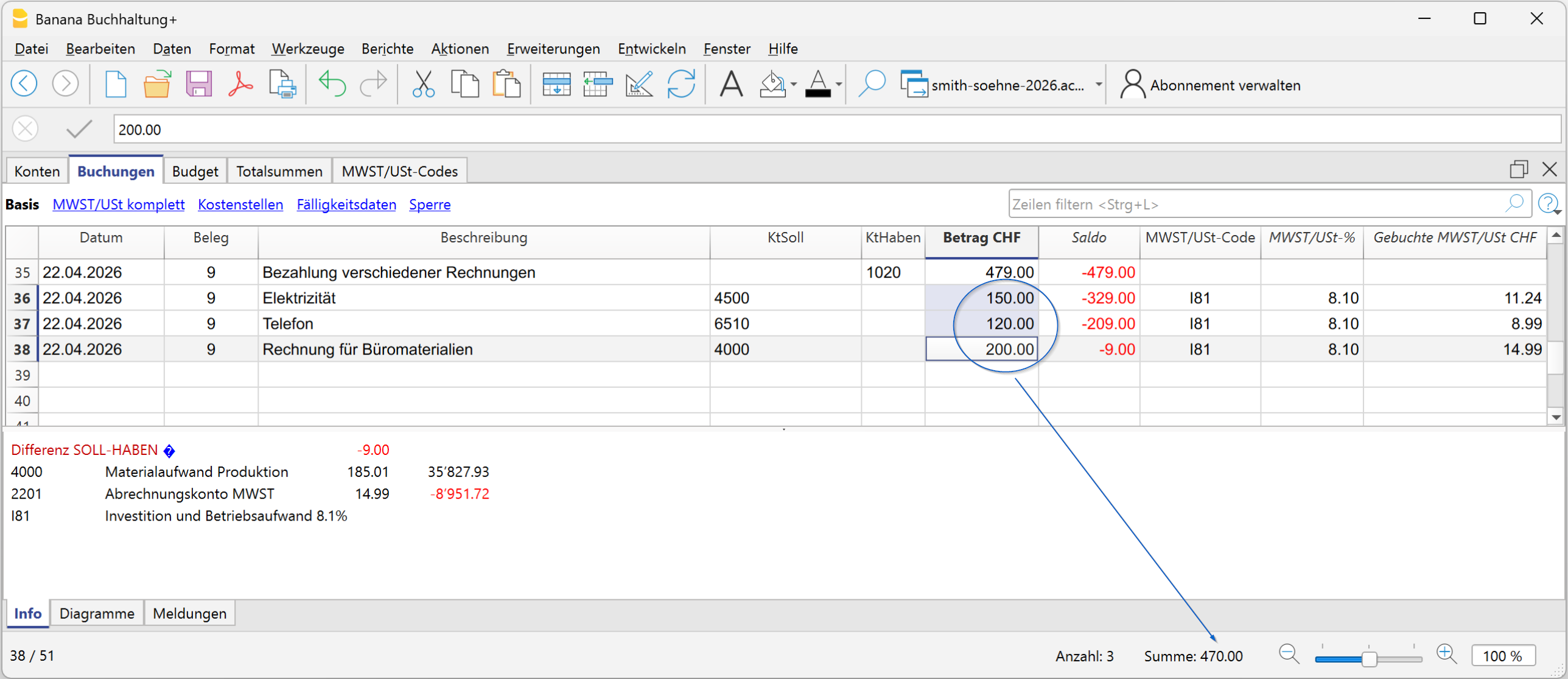 - Der Gesamtbetrag der Differenz wird im Informationsfenster am unteren Bildschirmrand dargestellt.